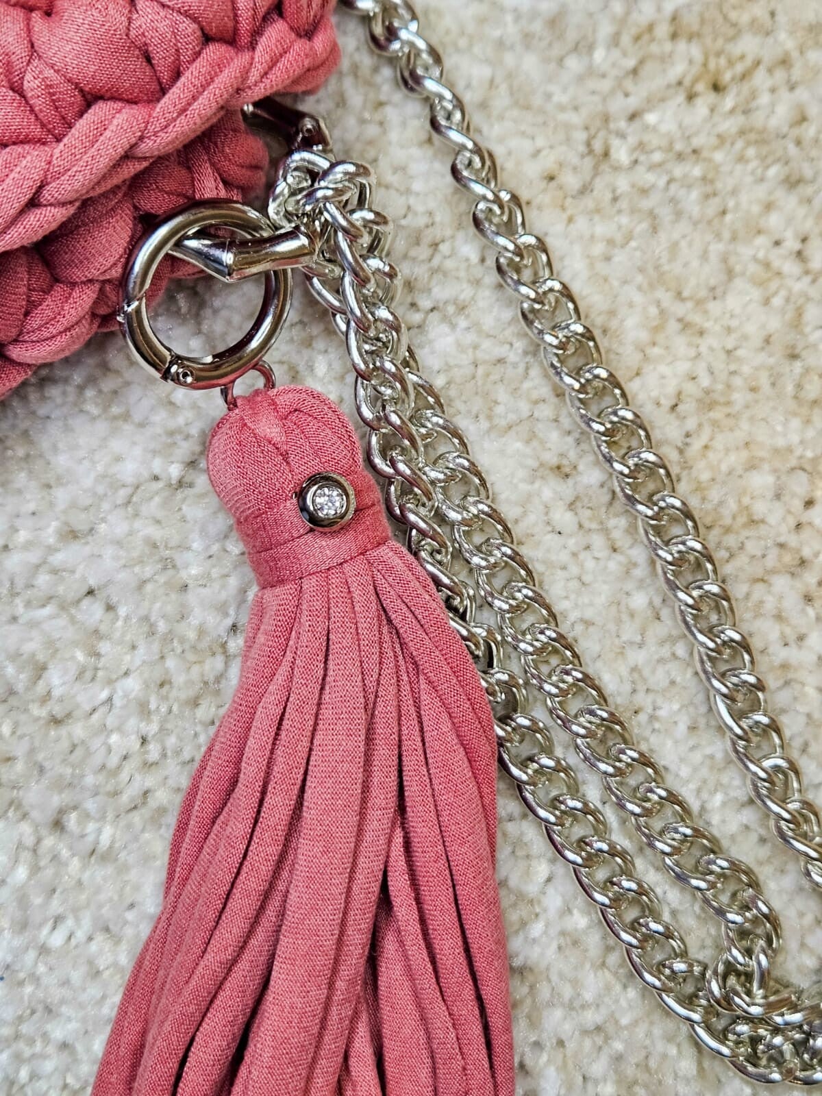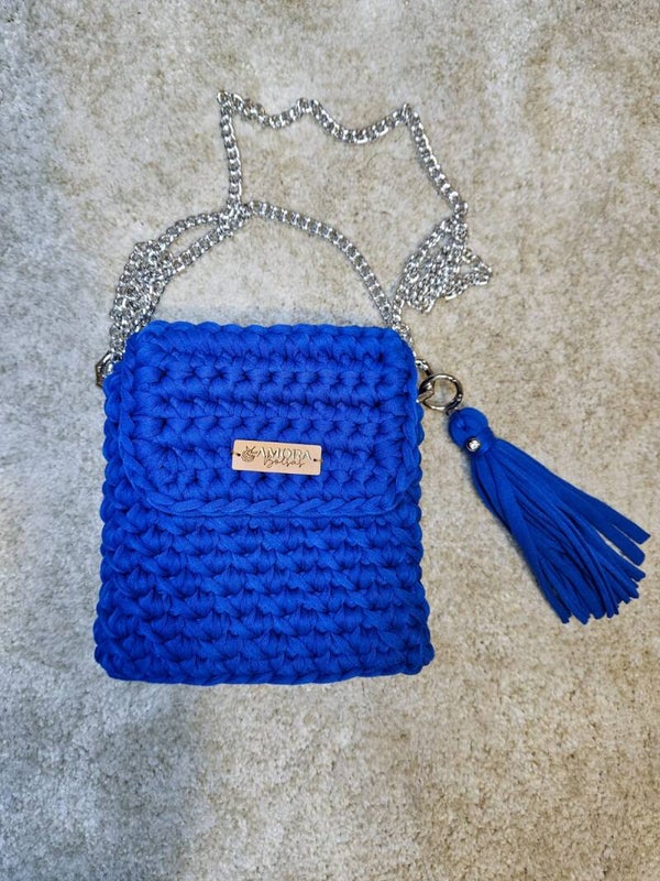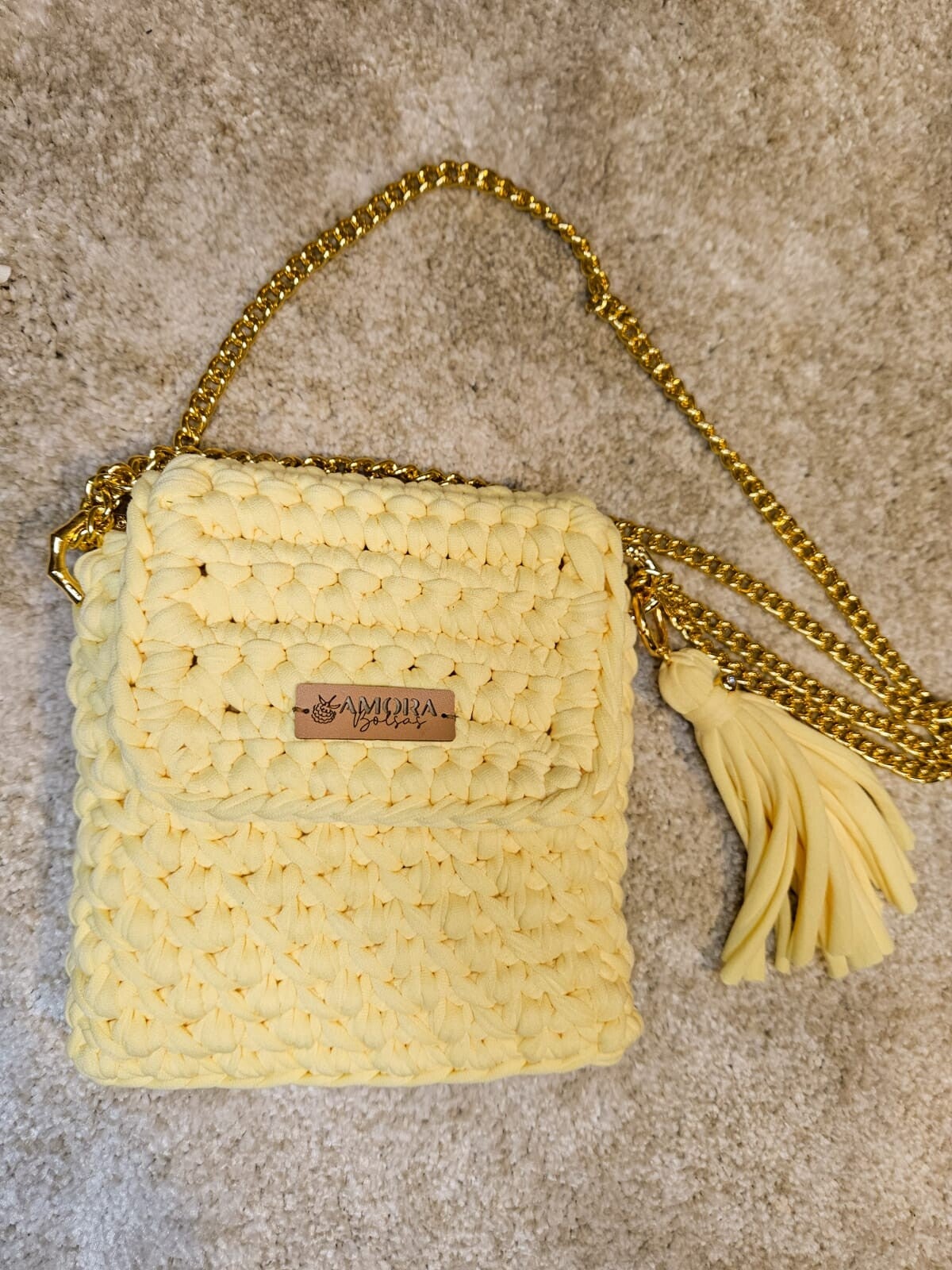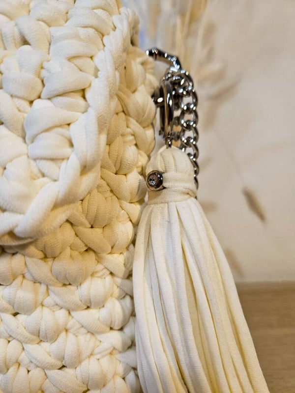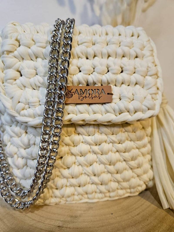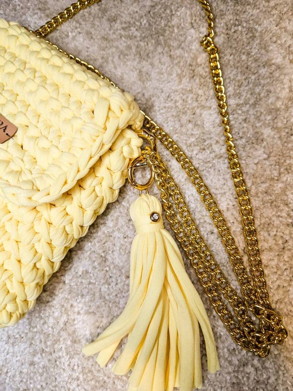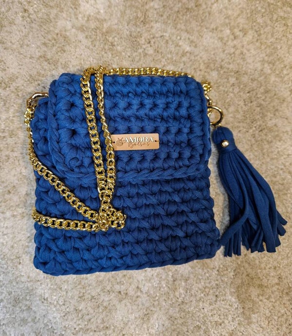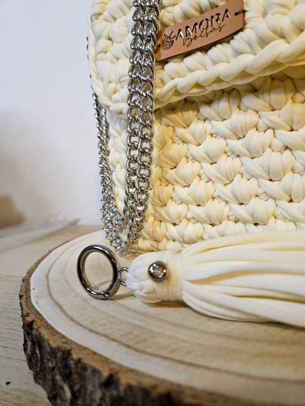 Handmade crochet bag. Made from premium mesh yarn with anti-pilling treatment. This bag has a metal strap metal with a hexagonal carabiner in two versions: golden and nickel-plated. It has a beautiful ornament with a Light Point to add charm. All materials used are of the highest quality and imported from Brazil.