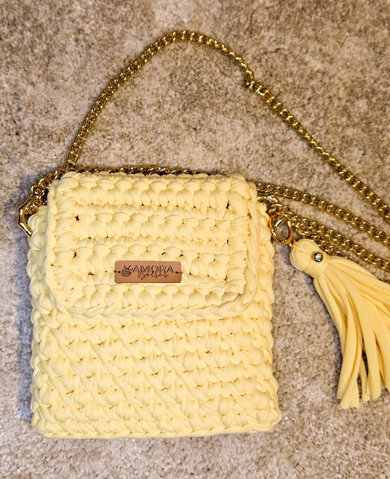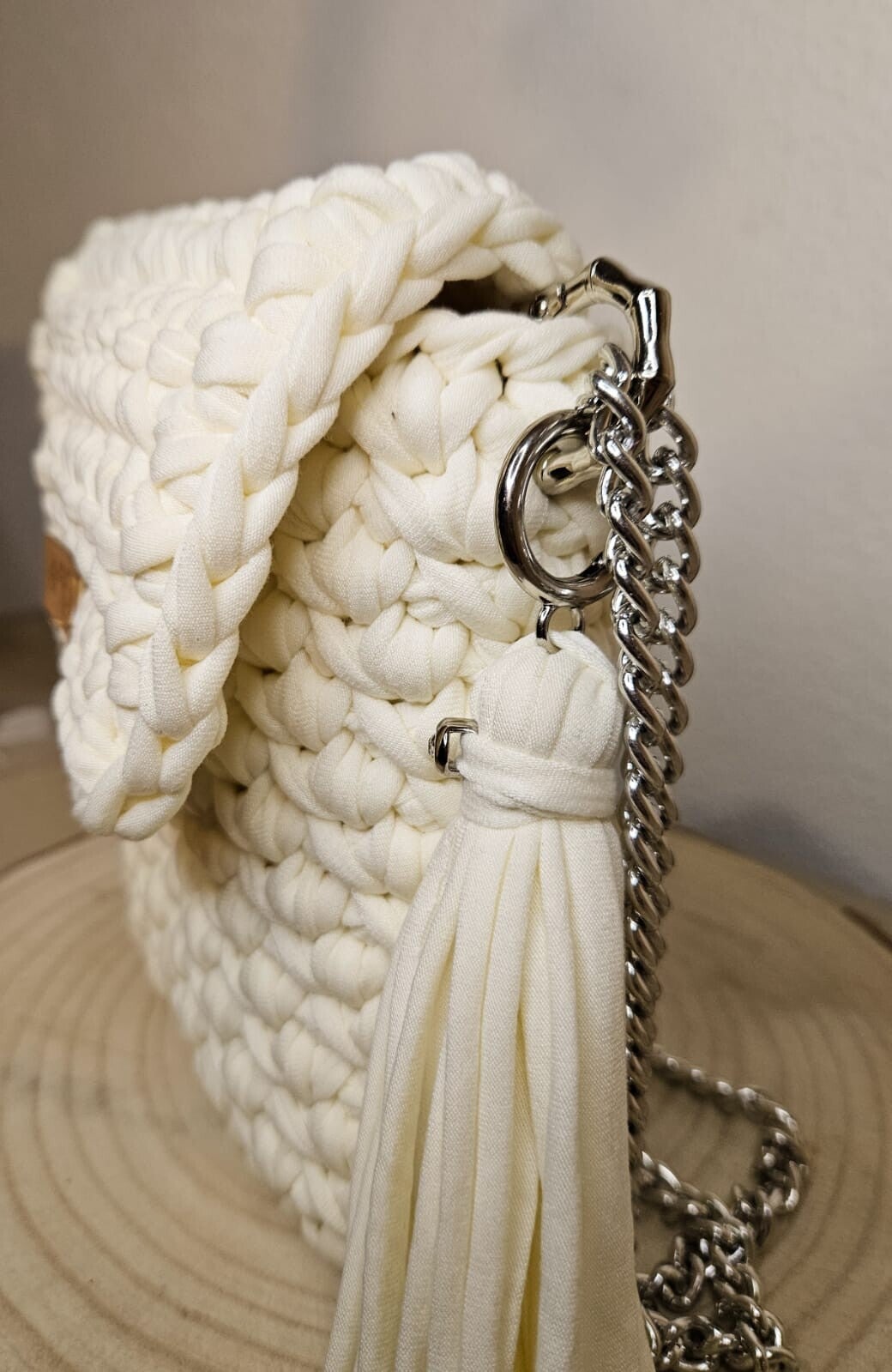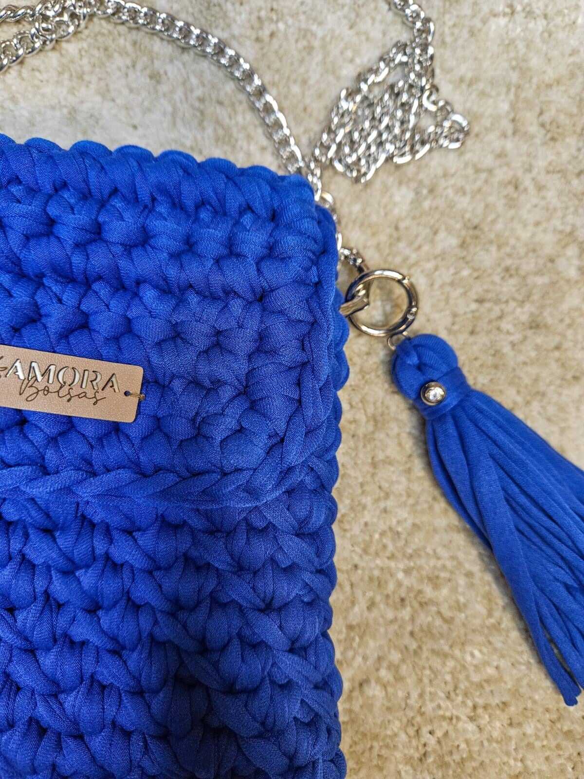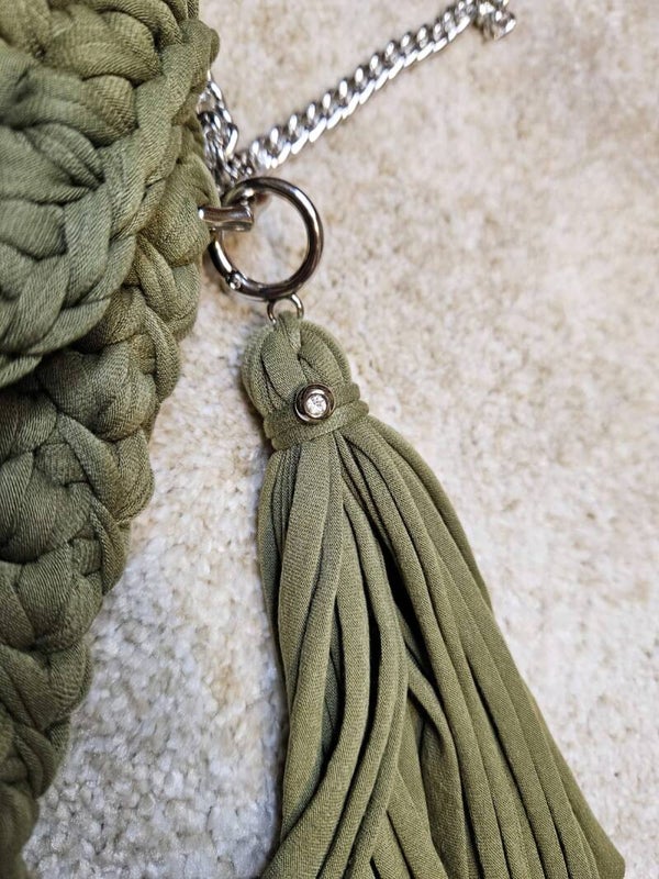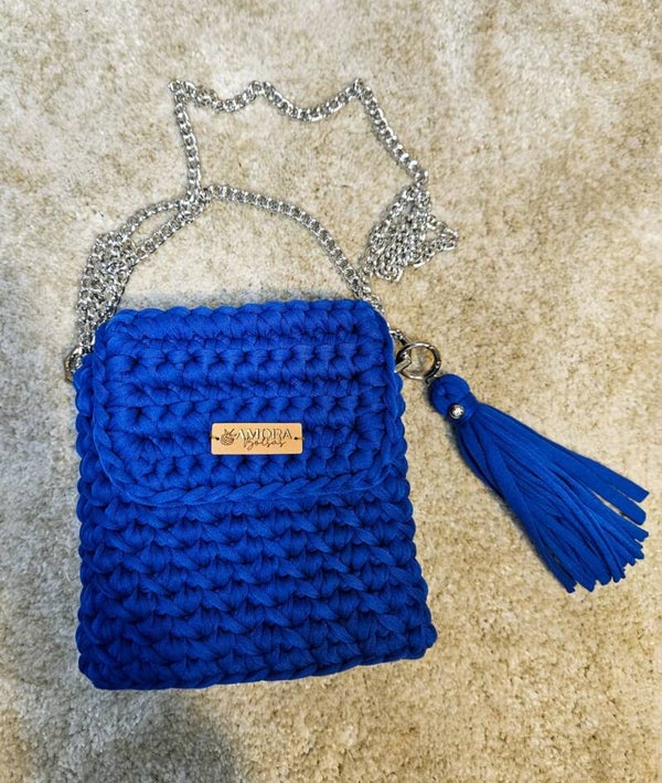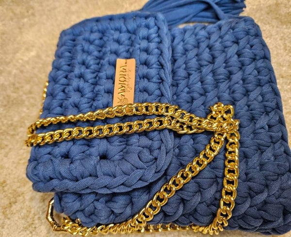 Handmade crochet bag. Made from premium mesh yarn with anti-pilling treatment. This bag has a metal strap metal with a hexagonal carabiner in two versions: golden and nickel-plated. It has a beautiful ornament with a Light Point to add charm. All materials used are of the highest quality and imported from Brazil.